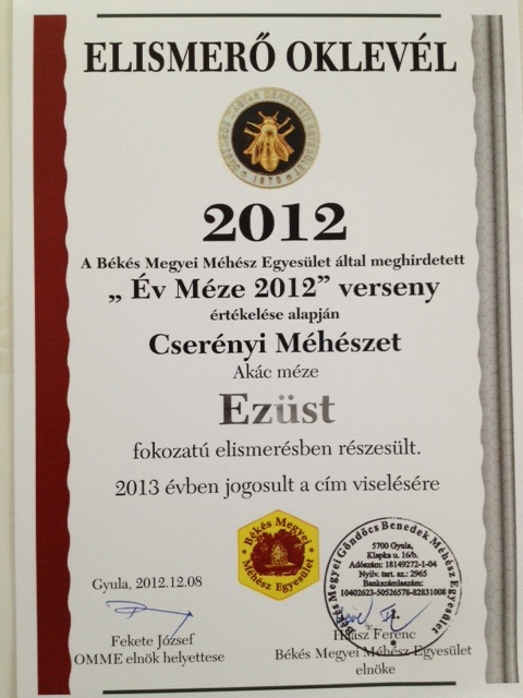 Ezüst fokozatú elismerésben részesült hársmézünk, arany fokozatúban akácmézünk.