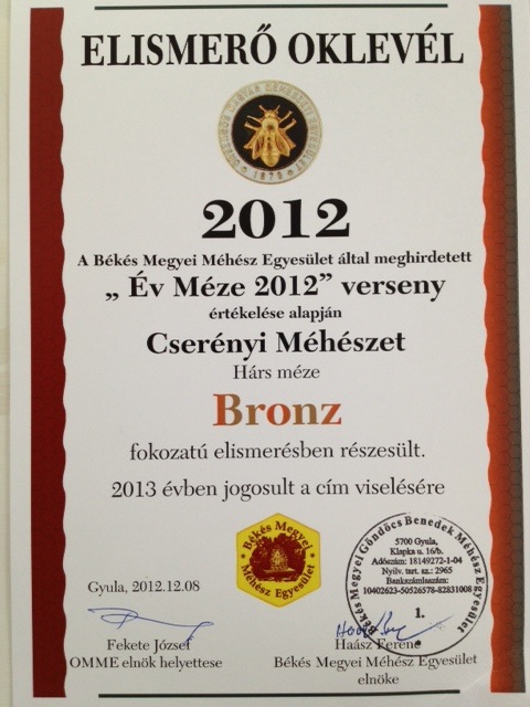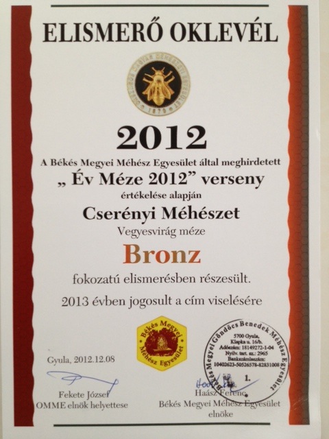 Bronz fokozatú elismerés hárs, selyemfű -és vegyesmézünknek